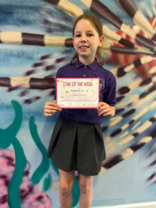 Polly (y5) has joined a theatre group and is taking part in dance, acting and singing. She has only recently joined but already landed herself star of the week. Well done Polly.