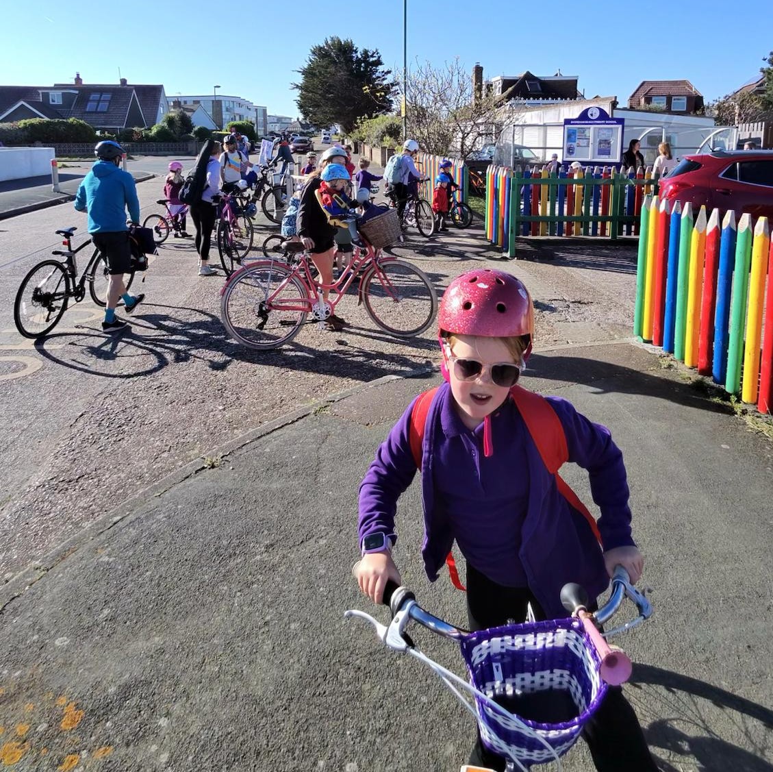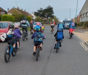 Everyone is welcome to join. They meet at Beach Green near the beach huts anytime from 8am and start rolling 08:15. They will head along Old Fort Road, lap Falcon Close (if time permits), continue round past the fort/sailing club, then back along Harbour Way to the school. So join from the start or as we pass your nearest street.